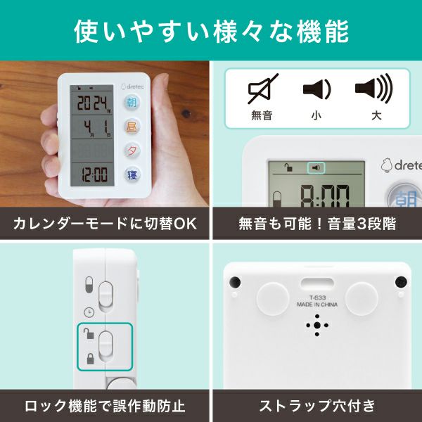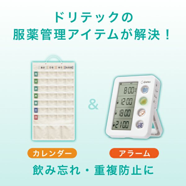 他の画像を見る 薬の飲み忘れ・重複防止に!アラームタイマーとカレンダーのセット登場 服薬管理アイテム「お薬DAYアラーム」「お薬WEEKカレンダー」セット T-633WTSK 当店特別価格 ¥ 3,759 税込 在庫切れ 詳細を見る お気に入りに登録する